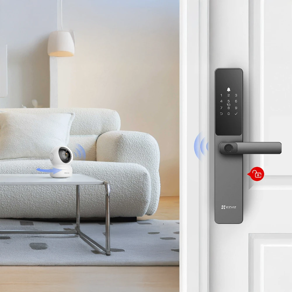 Khóa vân tay EZVIZ DL05 tích hợp thông minh với camera EZVIZ. (DL05 hiện hỗ trợ các camera sau để chụp ảnh hoặc quay video ở góc xem cài sẵn nhất định khi phát hiện cảm biến, gồm: H6c, C6N, CP1, TY1, TY2. Danh sách camera có thể mở rộng khi EZVIZ ra mắt nhiều sản phẩm tương thích hơn trong tương lai.)