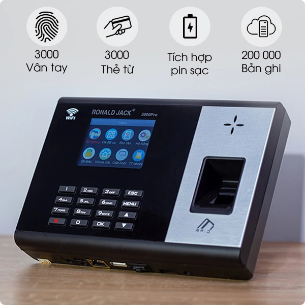 Máy chấm công Ronald Jack RJ3800 Pro có khả năng lưu trữ 3.000 vân tay, 3.000 thẻ và 200.000 lượt giao dịch gấp đôi so với các dòng máy chấm công thông thường.